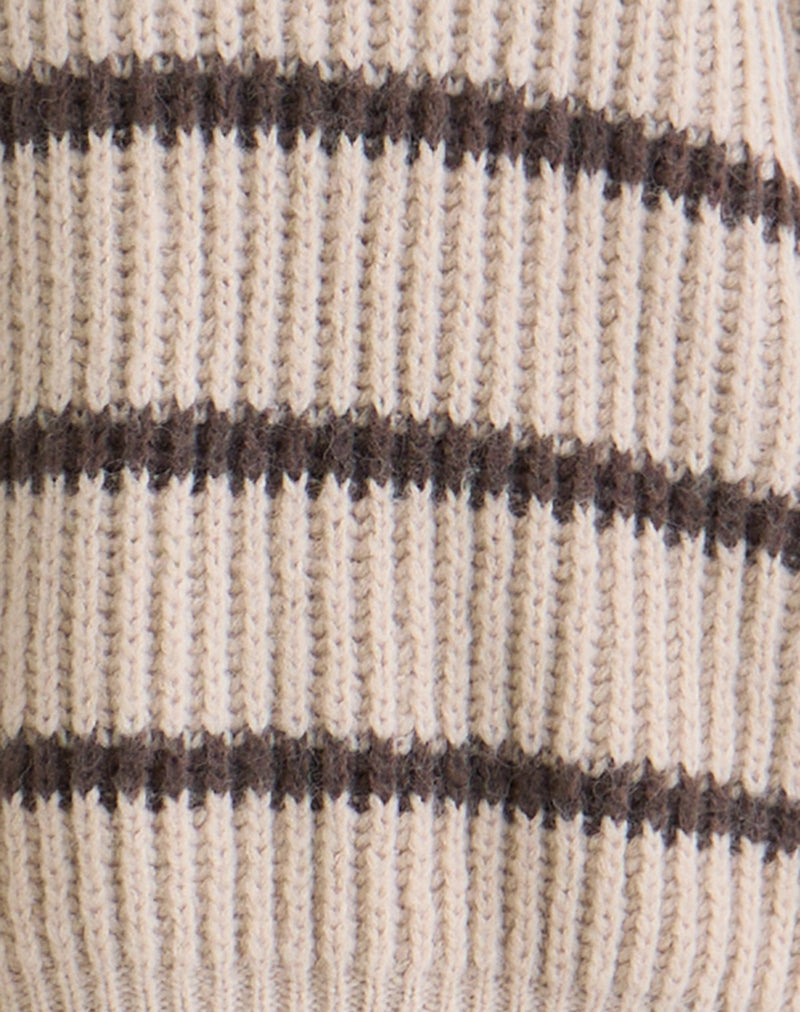 Namirta jumper in oat and dark brown chunky knit. Features contrast horizontal stripes and a relaxed, slouchy silhouette with dropped shoulders and long sleeves. Style with our dark navy Rafta mini skirt.